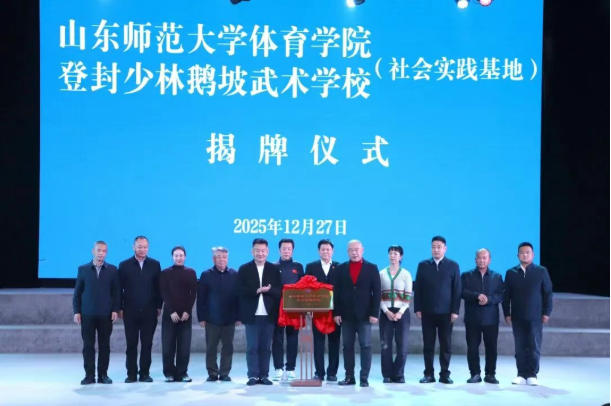 冬韵嵩山,暖意盈怀。12月27日,山东师范大学体育学院与鹅坡武校社会实践(实训)基地揭牌仪式隆重举行。出席本次活动的领导有中国学生体育联合会大学武术分会主席杜长有、副主席田苏辉、秘书长苏长来,山东师范大学体育学院院长王海鸥,鹅坡集团董事长梁少宗,鹅坡武校书记常福晓等,以及参加中国学生体育联合会大学武术分会2025年度会议的全体嘉宾。