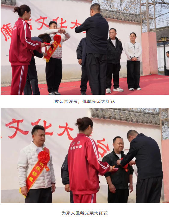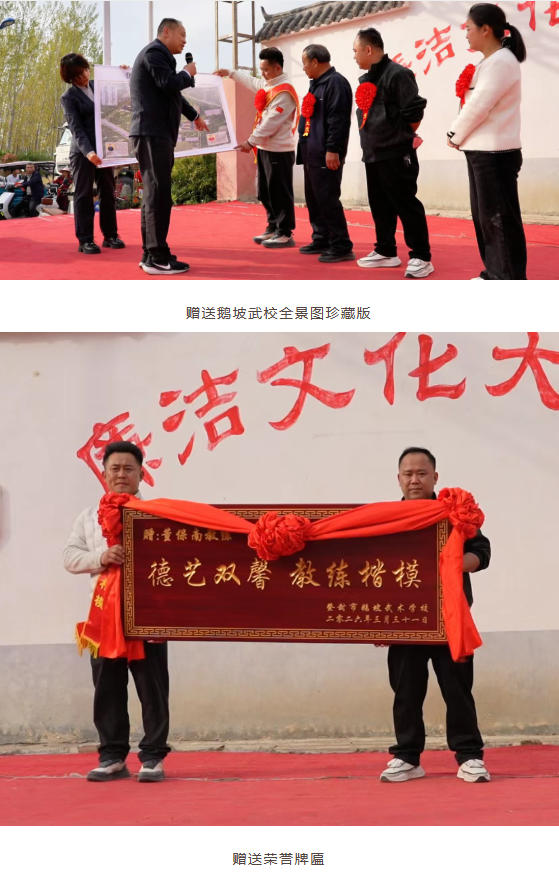 随后,进入隆重的授奖环节。鹅坡武校党总支书记、执行校长常福晓为董保南教练披上荣誉绶带,为他和家人佩戴象征光荣的大红花,并赠送鹅坡武校全景图珍藏版及荣誉牌匾,每一个环节都庄重有序,满含学校对董保南教练的认可与期许。
