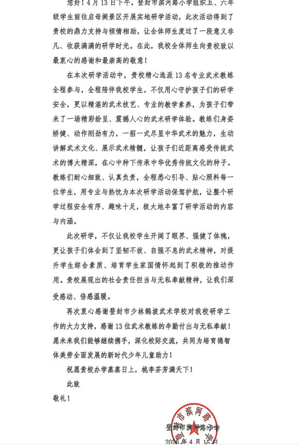 4月15日,登封市滨河路小学特意送来一封饱含深情的感谢信,对鹅坡武校在4月13日研学活动中给予的鼎力支持与倾情相助,表示最诚挚的感谢与崇高敬意。