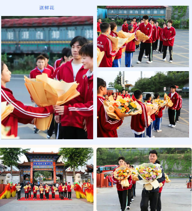 仪式现场,锣鼓震天,雄狮欢腾,迎接队伍身着红色校服,整齐列队,同学们依次为参赛师生献上鲜花。