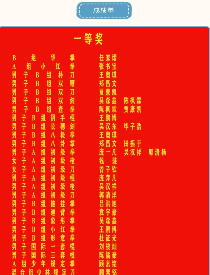 在本届武术大赛中,鹅坡武校以锻炼队伍为目的,派出以三线队员为主,二线队员为辅的46名队员参赛,以实战检验训练成果,为年轻队员的成长注入强劲动能。鹅坡健儿以昂扬的斗志、精湛的技艺脱颖而出,共斩获65枚金牌、12枚银牌、8枚铜牌,团队荣获“体育道德风尚奖”。