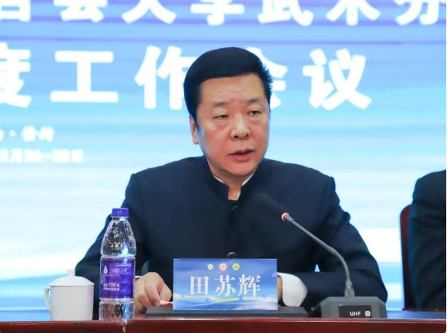 中国学生体育联合会大学武术分会副主席田苏辉代表中国武术协会致辞,鼓励大学武术分会立足高质量发展,组织建设再提升、锐意改革再创新、踵事增华再出发。